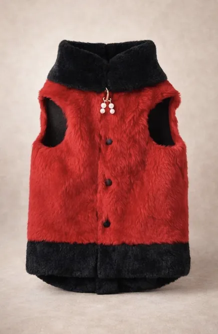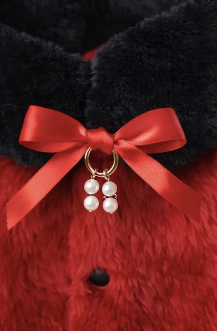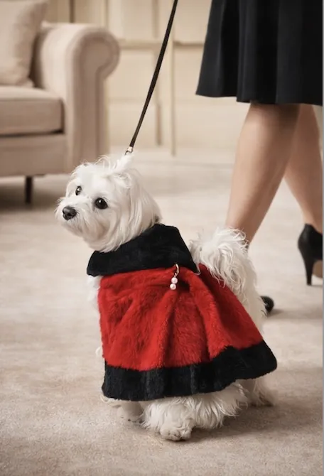 Abrigo para perro en tejido efecto velvet rojo con cuello negro y detalle de lazo satinado con perlas. Una pieza elegante y sofisticada para ocasiones especiales y paseos con estilo.
