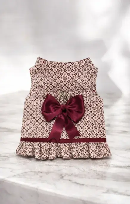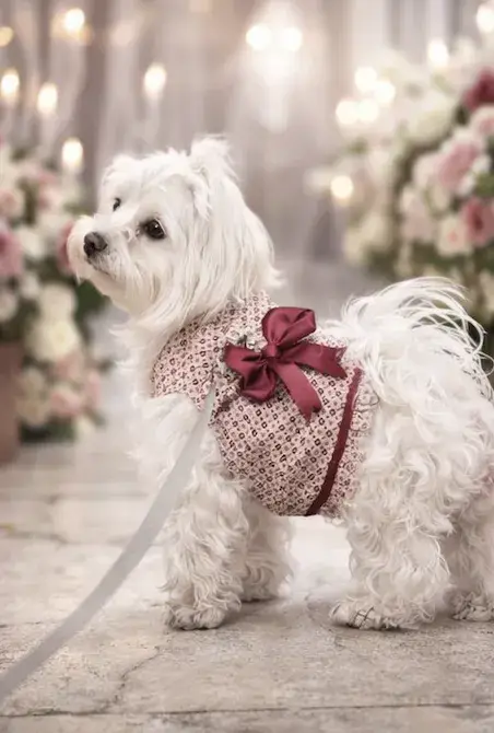 Arnés elegante para perro con lazo satinado burdeos, doble anilla metálica superior y diseño floral premium. Ideal para ocasiones especiales.