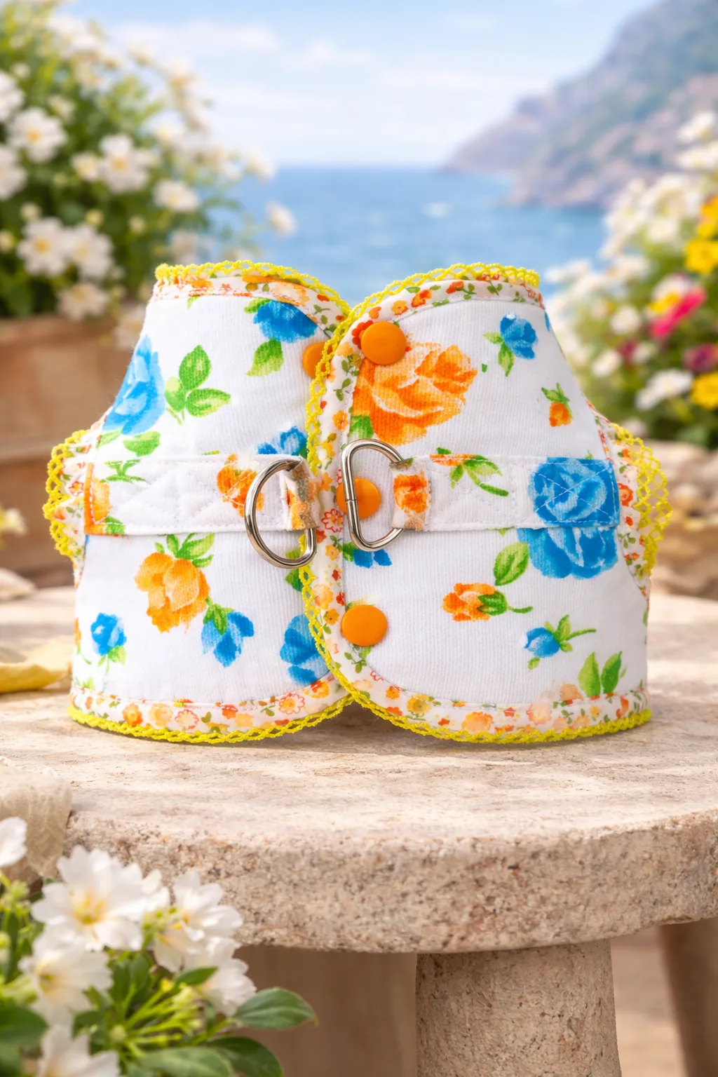 El Arnés Capri Azahar es una pieza artesanal inspirada en la luz y el color del Mediterráneo. Su estampado floral en tonos azul y naranja sobre fondo claro transmite frescura, alegría y sofisticación.