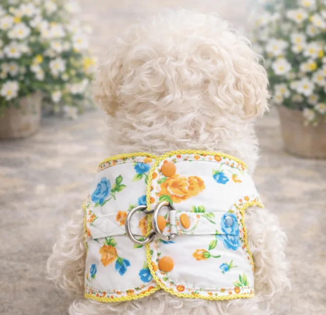 El Arnés Capri Azahar combina frescura mediterránea y elegancia artesanal. Con estampado floral vibrante, ribete amarillo y herrajes metálicos de alta resistencia, es ligero, cómodo y exclusivo. Diseñado y confeccionado a mano por Pet.Olid.