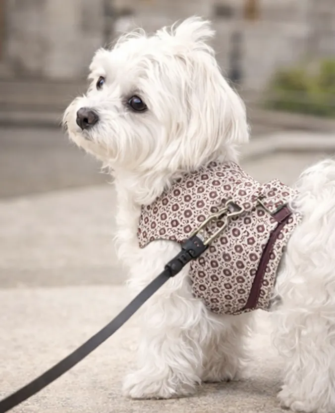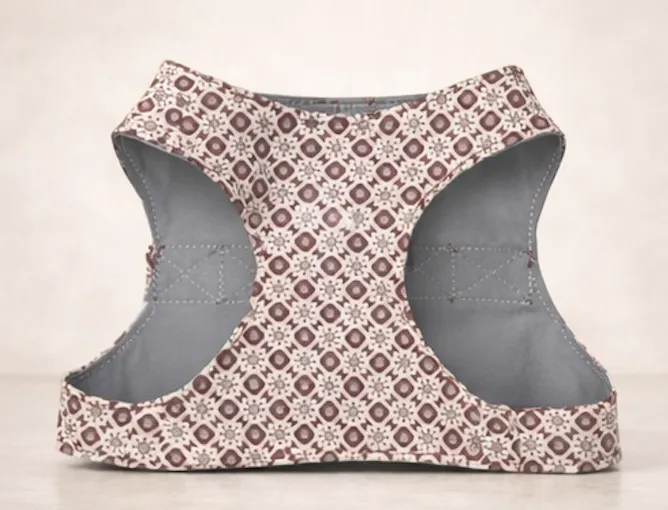 Arnés chaleco burdeos para perro con estampado geométrico elegante, doble anilla metálica superior y cierre lateral con botones de presión. Diseño urbano premium Pet.Olid. Arnés ergonómico e hipoalergénico para perro, hecho a mano en España con algodón transpirable. Disponible a medida para un ajuste perfecto y máximo confort. Un diseño único y exclusivo. Disponible para confección a medida. Color burdeos y crema perfecto para cualquier color de pelaje convirtiendo sus paseos en auténticas pasarelas.
