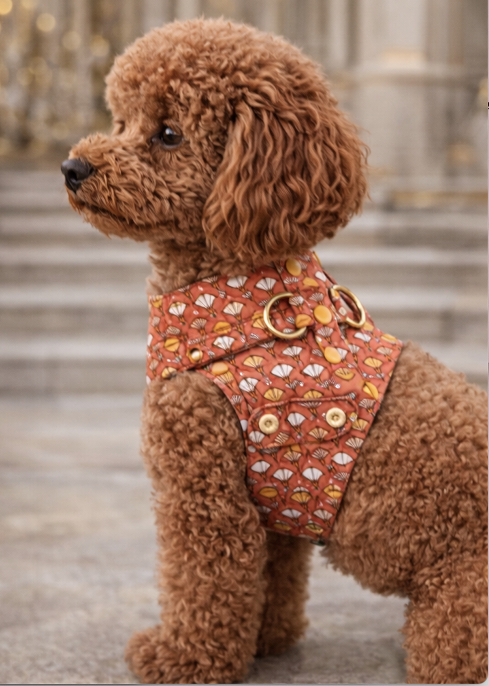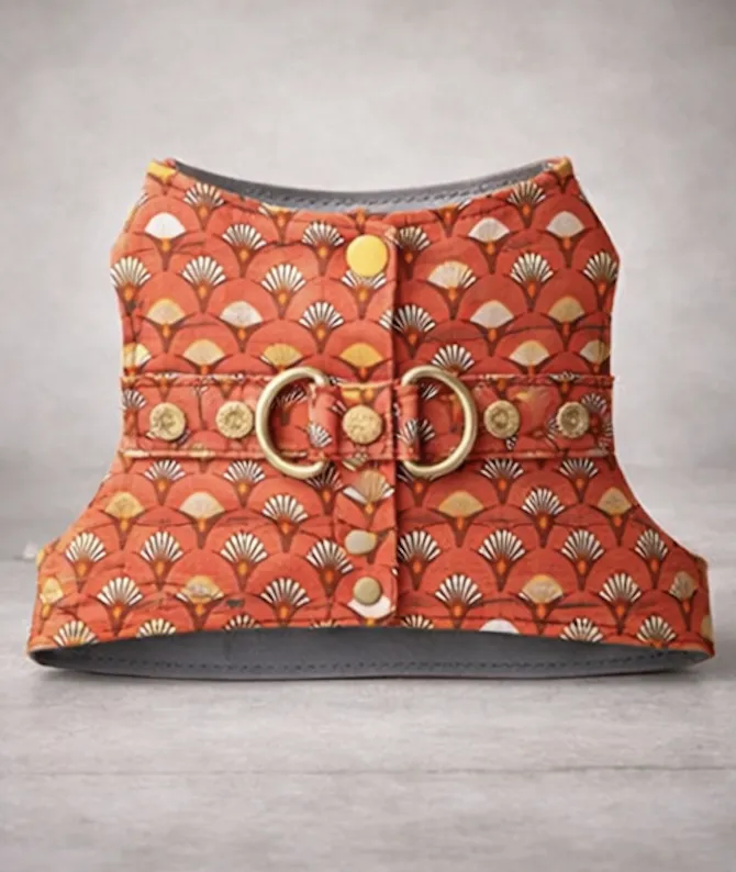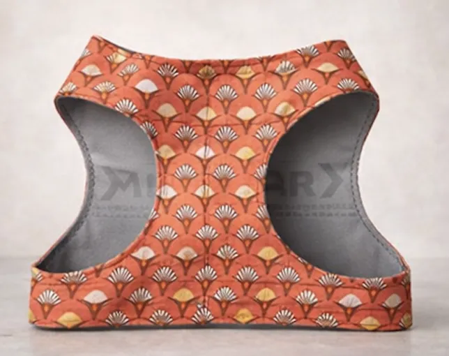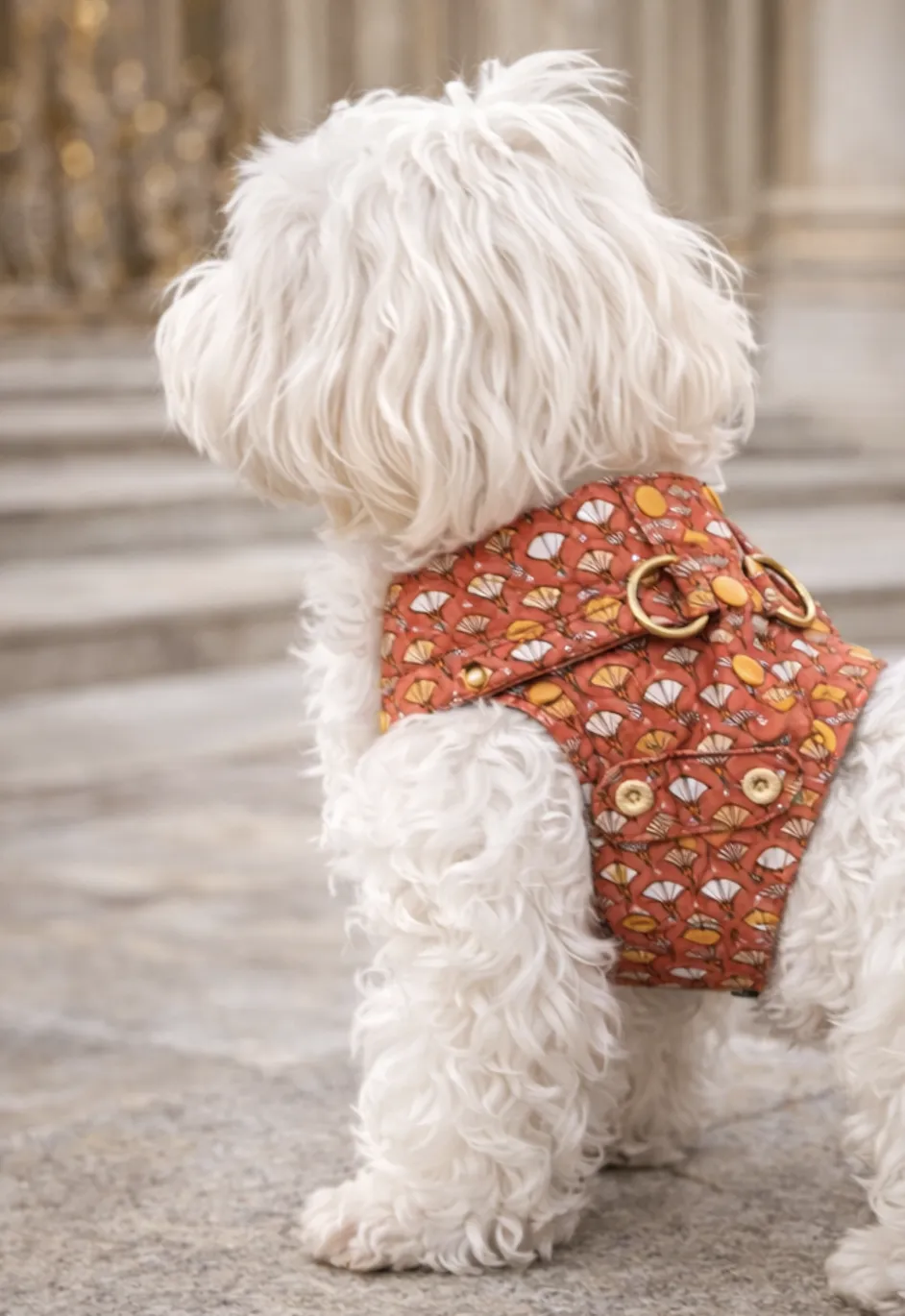 Arnés chaleco para perro con estampado art déco, doble anilla metálica superior y cierre lateral con botones de presión. Diseño urbano exclusivo Pet.Olid. Tejido de algodón de comercio de proximidad. Ergonómico, hipoalergénico y transpirable. Hecho a mano en España Disponible a medida para un ajuste perfecto y máximo confort. Para paseos, para mascotas activas y perfecto para eventos convirtiendo sus paseos en pasarelas y siendo la envidia canina!.