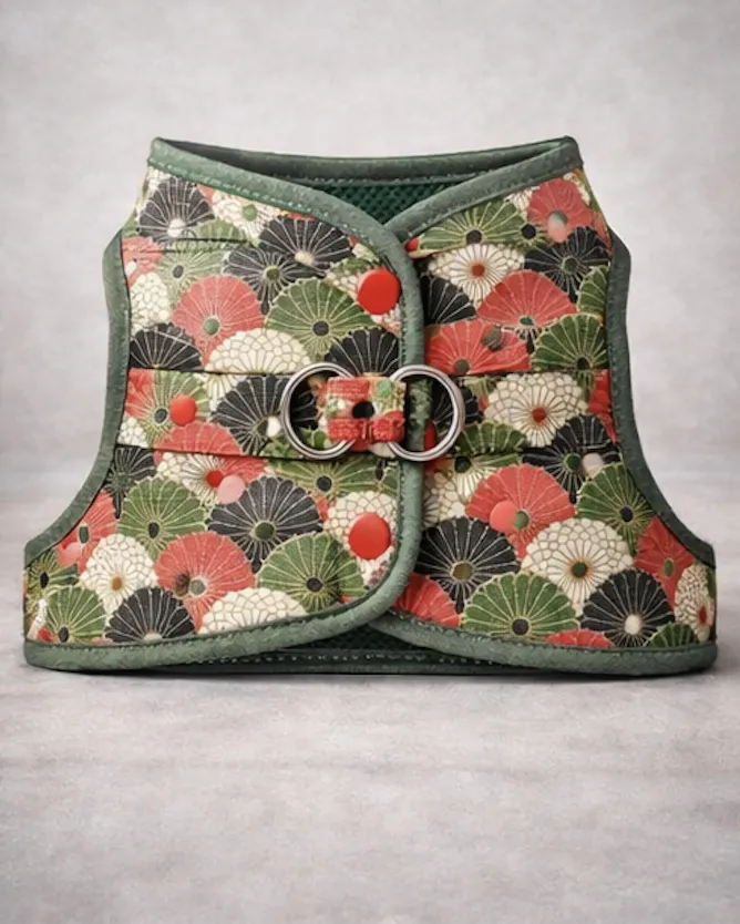 Arnés urbano para perro con estampado Sensu en tonos verdes, rojos y crema, herrajes metálicos y diseño envolvente cómodo y elegante. Ideal para paseos con estilo en ciudad. Arnés chaleco de algodón transpirable, hipoalergénico y hecho a mano en España.