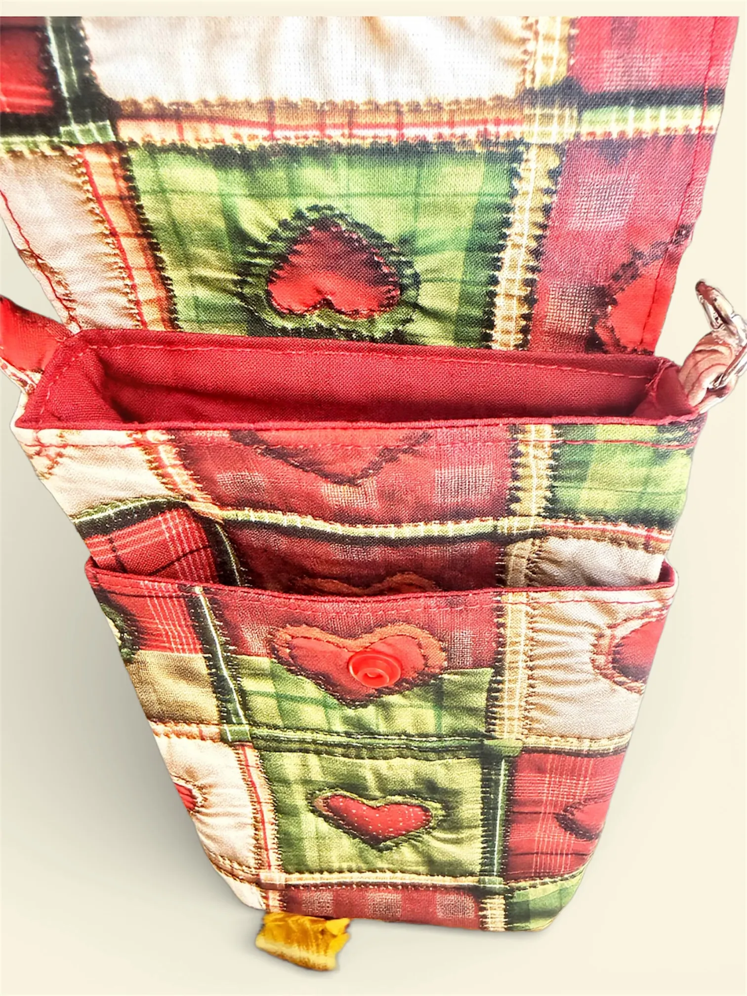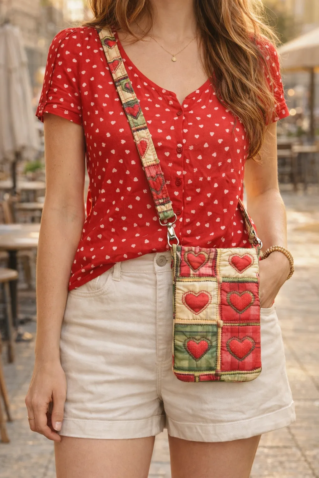 Bandolera cruzada para móvil pequeña modelo LOVE con diseño patchwork de corazones. Compacta, ligera y perfecta para llevar smartphone y esenciales con estilo.