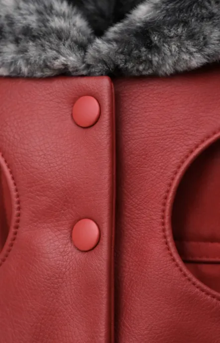 Cazadora de piel roja para perro con acabado sofisticado, interior de algodón y remates en tejido polar. Diseño urbano con doble anilla metálica y estilo premium.