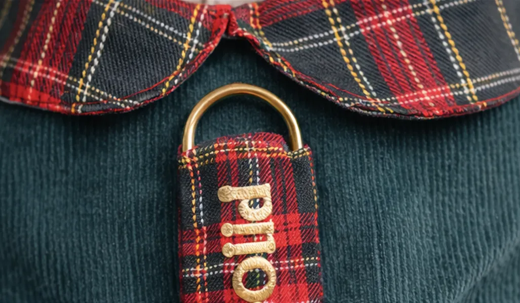 Su diseño une un cuerpo de pana verde suave con una falda tartán escocesa, creando un estilo atemporal que recuerda a la estética clásica británica.
