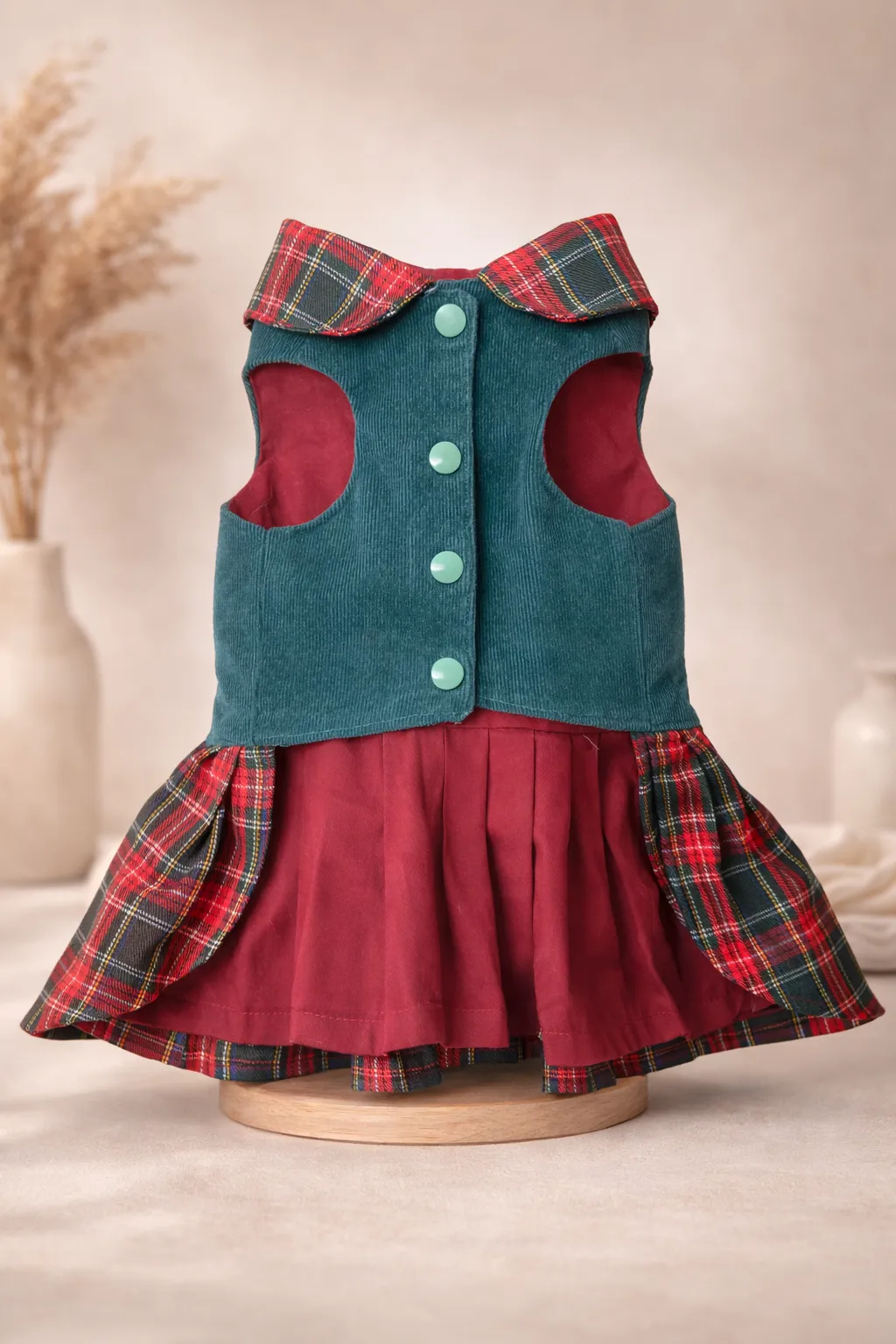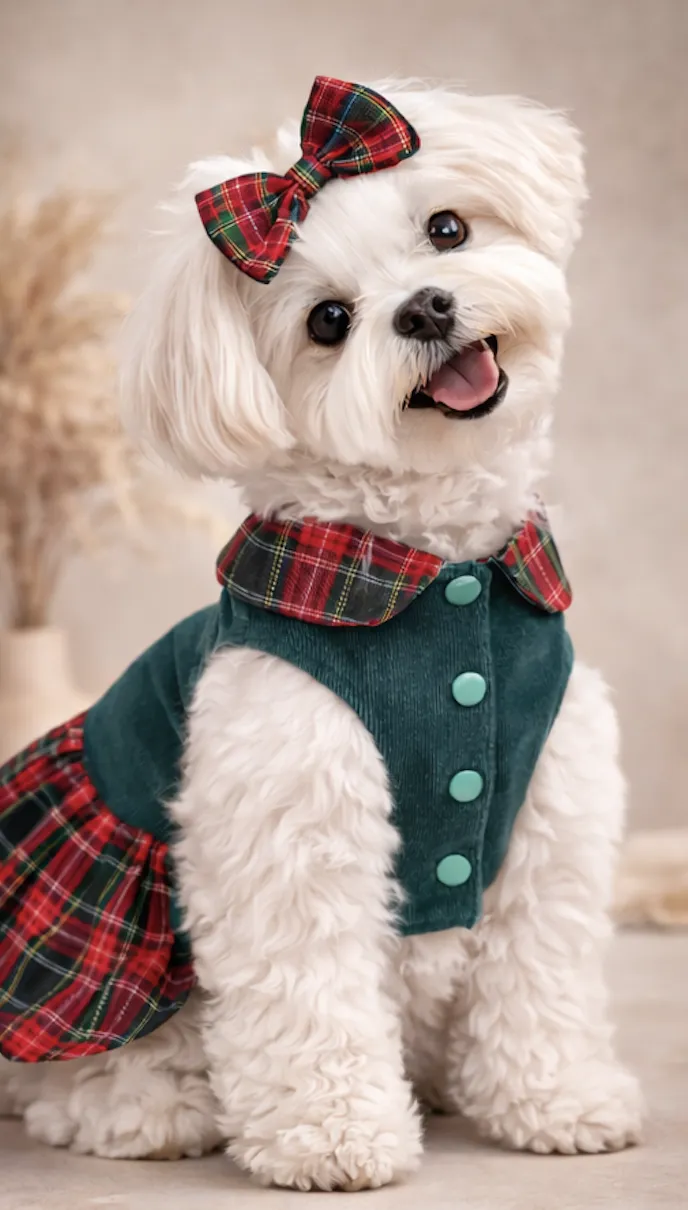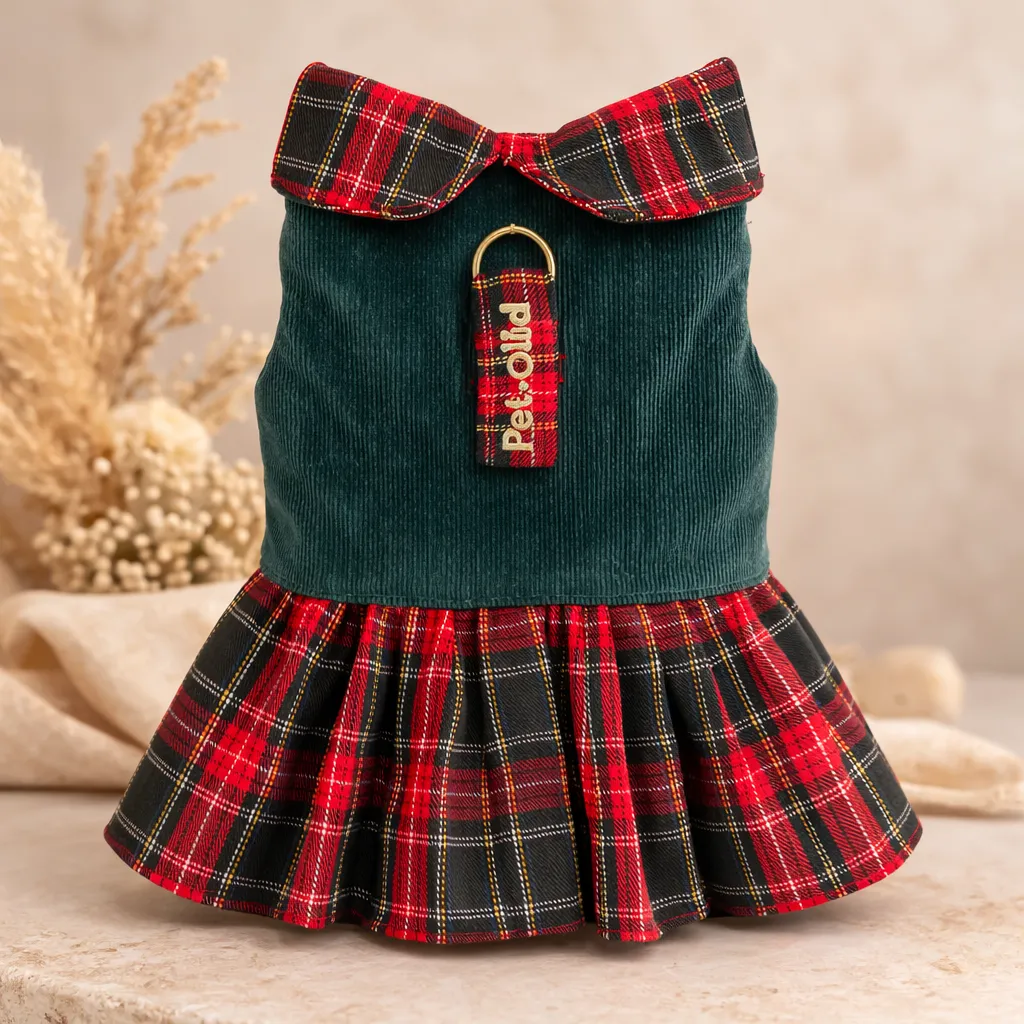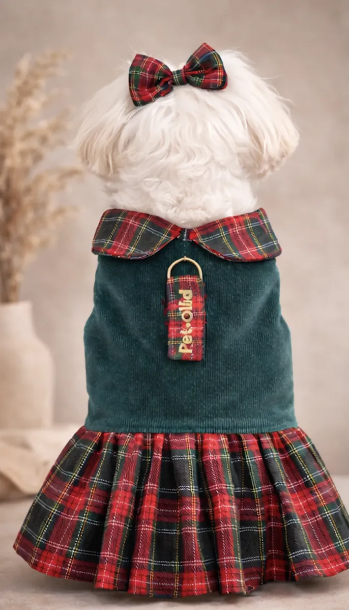 El Vestido Balmoral de Pet.Olid combina elegancia clásica y estilo británico con una falda tartán escocesa y un cuerpo de pana verde suave. Un diseño sofisticado pensado para perros pequeños que destacan por su estilo.