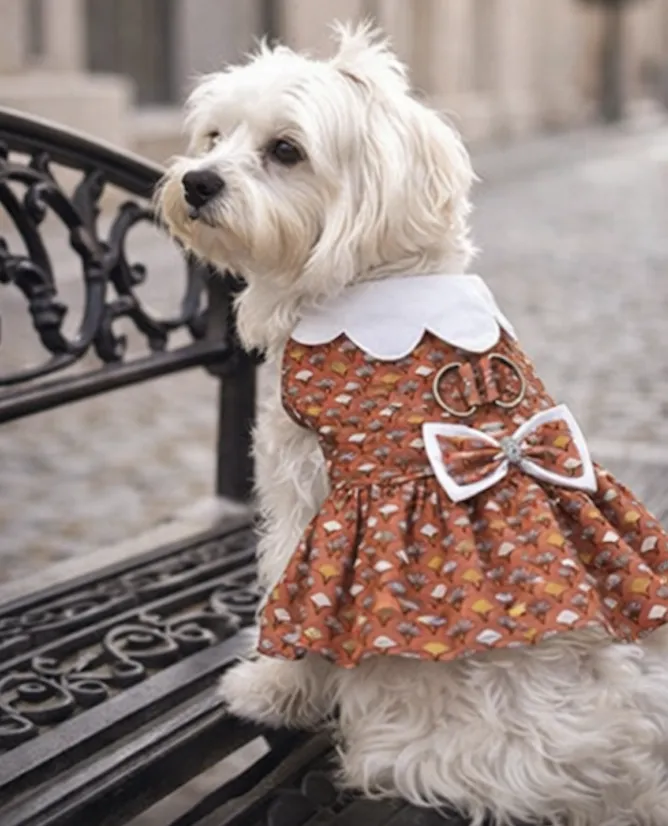 Vestido elegante para perro con arnés integrado, diseño urbano sofisticado y lazo joya que realza su silueta. Funcionalidad y estilo en una sola pieza.